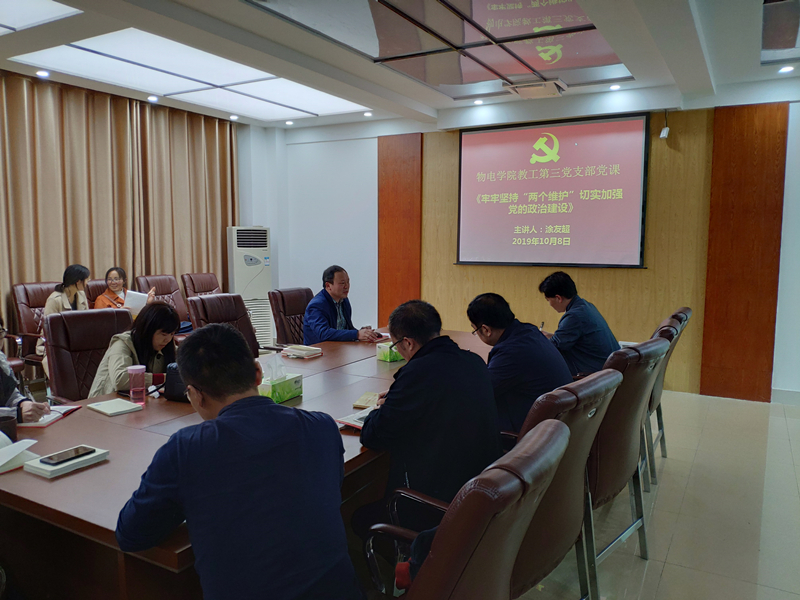 根据《物电公司“不忘初心、牢记使命”主题教育方案》安排,10月8日,公司教工第三党支部在理科楼911会议室开展主题教育专题党课,党课题目为《牢牢坚持“两个维护”,切实加强党的政治建设》,党课由公司党委委员、经理涂友超主讲,公司教工第三党支部党员聆听了党课。