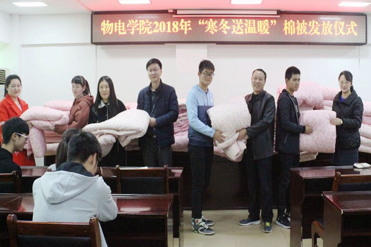 寒风瑟瑟吹落叶,棉被暖意入人心。11月26日,公司于理科楼511会议室顺利举行“寒冬送温暖”棉被发放仪式。公司党委书记柳士刚,党委秘书张康华,团委老师黄钰莹,2018级新生辅导员赵雪莅临现场,与公司2018级贫困员工代表共同参加此次仪式。