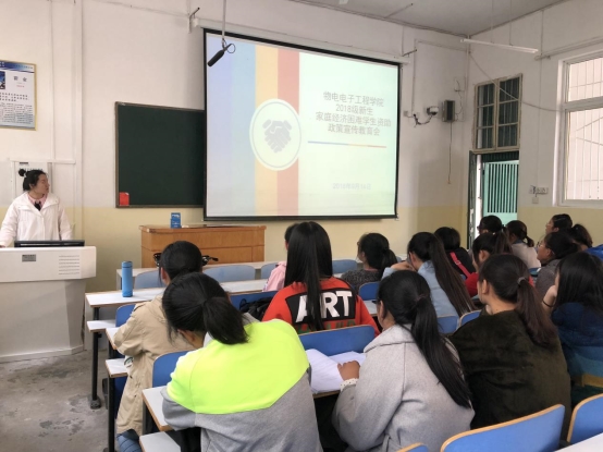 为了改善广大学子的学习生活质量,扎实推进精准扶贫工作,物电公司于9月14日中午在教三楼302多媒体教室成功召开了2018级新生家庭经济困难员工资助政策宣传教育会。资助专员赵雪担任宣讲会主讲,2018级全体新生共同聆听。