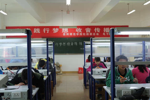 选手们面对此次大赛沉着冷静,自信坦然。比赛一开始参赛选手认真研究收音机的电路原理图,将各个电路元件和电路图一一对照熟练迅速地安装在线路板上,然后右手拿着电烙铁蘸着松香,左手拿着焊铁丝,左右手并用,将装好的电路元件用电烙铁头接触元件引脚与铜箔,烙铁很快离开,留下的焊点光滑,规则无误,焊锡冷却后剪去离铜箔多于2到3厘米的引脚。电路板焊接完成后,参赛选手信心满满地进行组装,在电倍器和双联上安装拨轮,用4条电线连上喇叭、正极片、弹簧,并将正极片、弹簧分别插入机志,装好天线上好螺丝,一台收音机组装完毕,参赛选手掩盖不了内心的喜悦,青春的脸上已经露出甜美的微笑。经过精心的调试,当自己制作的收音机发出声音时,不禁欢呼起来,其兴奋之情溢于言表。讲过评委老师的认真筛选,公平评定,此次大赛的结果是,第一名刘富昌,第二名刘国超、杜远远等。此次大赛选手们熟练的拼装技术,过硬的焊接技术让评委老师赞不决口。