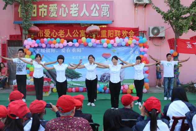演出在老员工舞蹈团带来的肚皮舞《红唇烈焰》中拉开了帷幕,音乐之声志愿者们的《母亲》、《父亲》用情真意切的歌声拨动着老人的心弦,不少老人在歌声中悄然落泪,小志愿者夏一天的葫芦丝表演《荷塘月色》淡雅清新,由华锐公司带来的手语表演《最好的未来》整齐化一,唯美动人。其间,爱心老人公寓献经理李冬珍、公司团总支书记刘华超献上的节日慰问祝福更是博得了老人们的阵阵掌声,最后,在伴乐独唱《夕阳红》中,信阳市共青团委志愿者工作部部长阮飞,青年志愿者协会副会长王相亚,团总支书记刘华超上台为老人们切蛋糕,老人们的欢笑声合着蛋糕的浓香中,汇演圆满结束。