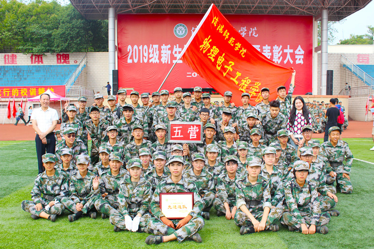 军训汇演在庄严的国歌声中拉开序幕。董事长李俊在军训总指挥员的陪同下,对公司2019级新生军训方队进行检阅并向其致以亲切问候。随着《分列式进行曲》音乐奏响,公司受阅新生踏着整齐的步伐经过主席台接受领导检阅,以嘹亮的口号表达物电学子的豪迈激情,以规范的动作展现认真严格的精神品质,以整齐的队列展示军事训练的丰硕成果。他们神采奕奕,口号响彻操场,自信的脸上洋溢着胜利的喜悦,铿锵的步伐写下收获的幸福,充分彰显出公司学子青春向上、斗志昂扬的精神风貌。分列式结束后,公司新生积极配合,参与表演的集体操、歌咏、格斗术、组方阵摆字形等项目展示轮番上阵,为在场师生带来了一场精彩绝伦的视听盛宴。结合军训期间训练情况、汇演成果、后勤服务等综合指标考量,公司荣获“先进连队”荣誉称号。