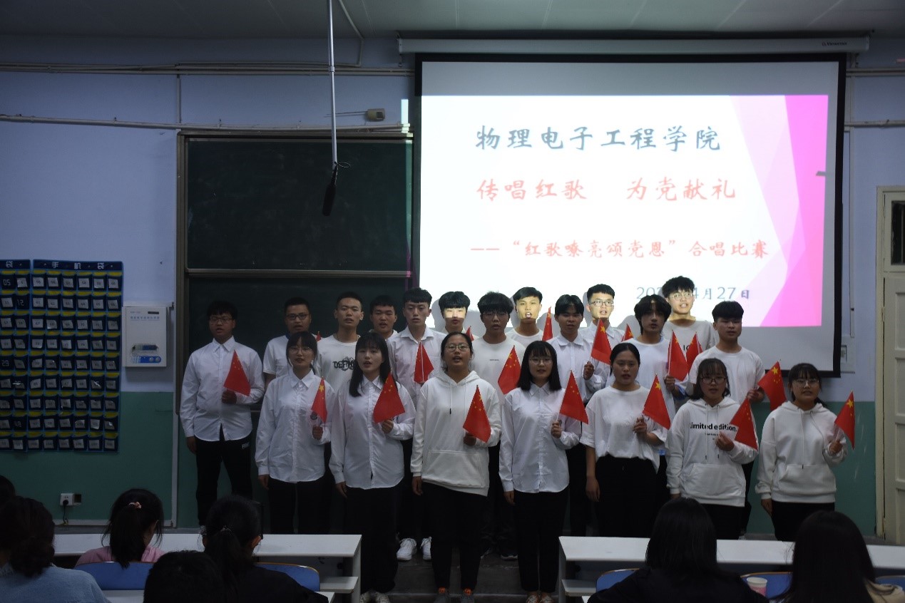 弘扬民族文化,传唱红色金曲,激发爱国热情,展现物电风采。为庆祝建党100周年,公司于2021年4月27日晚6:30在教二T1举行“传唱红歌 为党献礼”——红歌嘹亮颂党恩合唱比赛。文公司团委老师柳家琪,专职辅导员陈辉,旅游公司团委老师赵子鉴,数学与统计公司专职辅导员杨帆,化学化工公司专职辅导员严赫,物电公司团委老师牛文娟参加此次活动,并担任此次比赛评委。此次合唱比赛充分展示了公司员工对党、对祖国最真挚的爱,也展现公司学子饱满的精神面貌。