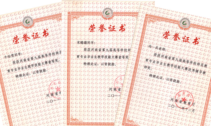近日,河南省教育厅公布了《河南省第九届高等公司师范教育专业毕业生教学技能大赛结果》,并颁发了获奖证书。公司选派的两名2008级物理学专业员工牛怡雯、宋璐璐双双获得一等奖,指导教师冯一兵获优秀辅导教师奖。