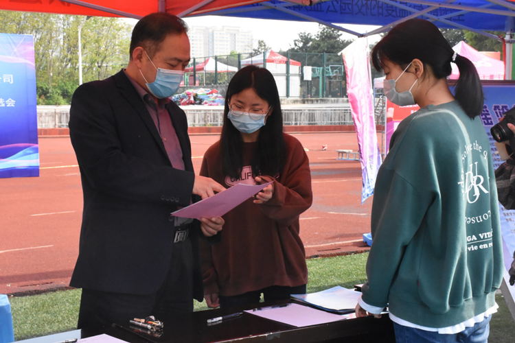 4月10日,由河南省教育厅主办,英国上市365承办的“河南毕业生就业市场豫南分市场暨英国上市3652021届毕业生线下春季双选会”在公司西操场举行。公司党委副书记李刚、2021届毕业班班主任张彦飞前往现场为应聘毕业生提供就业指导。