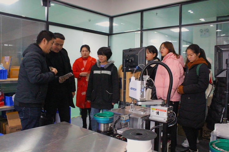 学子们在该公司主管王嘉明,课长曹翠的带领下进入公司参观实验室、车间、宿舍楼等建筑,通过观看宣传片了解关于我们。学子在积极的交流中得知,该公司近年来致力于磁性材料应用研发和自动化生产开发项目,拥有设备自主开发团队和创新人才,拥有1项发明专利,67项实用型专利,目前公司在自动化生产电子终端产品,用磁组件上已取得突破性进展。分拣,组装及擦胶等工艺已实现自动化生产,实现自动化后提升效率,并大大降低质量风险,由自动化设备来取代人,可提升产能2倍,减少50%的人力,提高质量保证。参观结束,张昆总结到,见习培训授经验,专业学习谋发展,希望学子们做到学以致用,掌握专业领域,充分认识到理论与实践相结合的重要性。