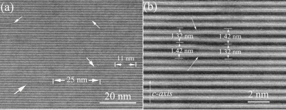 图1. 利用球差电镜技术,在CaKFe4As4单晶样品中观察到存在长度约11-25nm、厚度约1.42nm的KFe2As2插层。